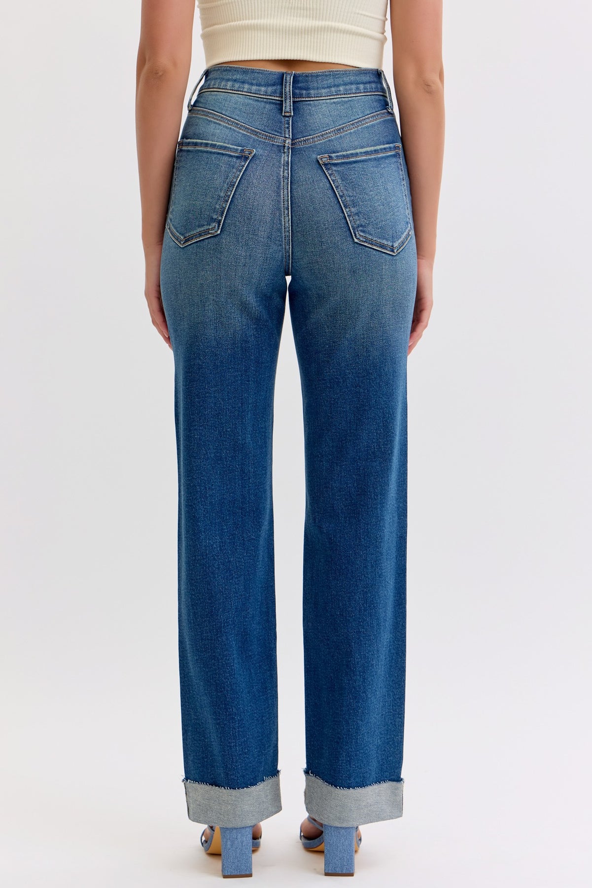 Dark denim super high rise dad jeans w/ cuffed bottom